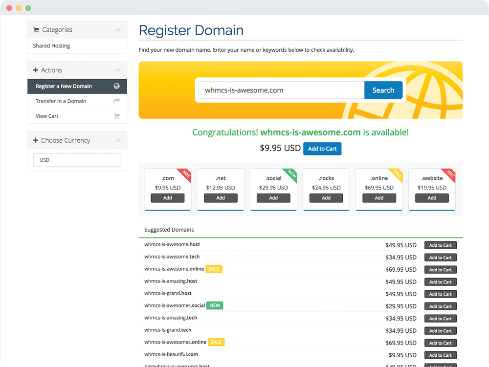 WHMCS با پشتیبانی داخلی برای نامگذاری دامنه با APIهای eNom و LogicBoxes (ResellerClub، NetEarthOne و غیره...) ارائه میشود که به شما امکان میدهد بهترین تجربه خرید دامنه را به مشتریان خود ارائه دهید.